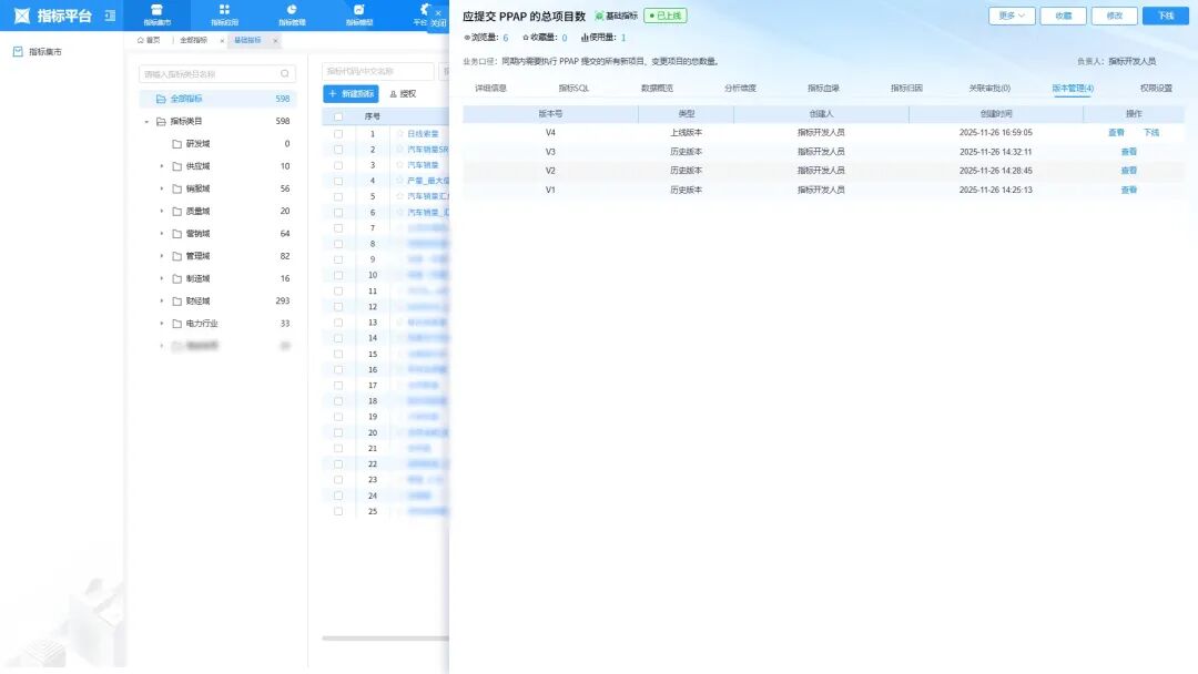 借助指标平台,变更可实现全程留痕与实时同步,业务人员通过可视化界面修改计算逻辑后,系统会自动记录版本迭代轨迹,全公司可统一查看最新指标口径,彻底避免数据口径混乱问题。