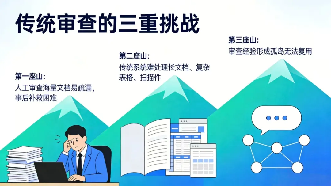 项目资料、财务单据、检测报告等各类文档审查,是企业运营的关键环节,但这项工作重复琐碎、易出疏漏,长期面临效率低、准确率不足、经验难沉淀的三大挑战。