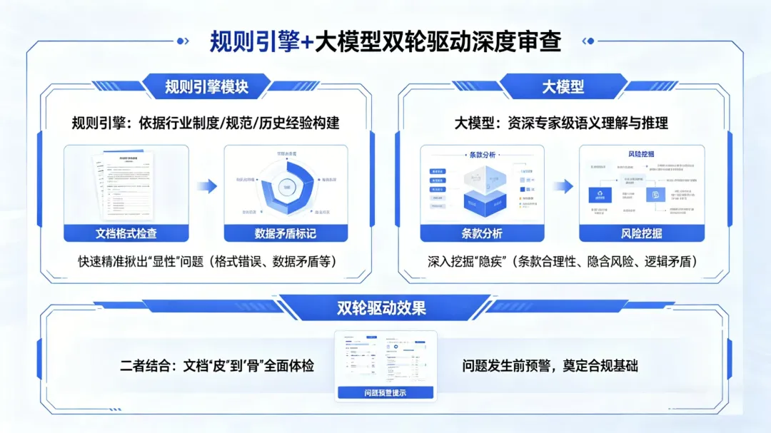 规则引擎依据行业制度、规范与历史经验梳理构建,快速、精准地揪出格式错误、数据矛盾等“显性”问题。大模型则化身资深专家,凭借强大的语义理解与推理能力,深入挖掘条款表述的合理性、隐含风险及逻辑矛盾,专治各种“隐疾”。二者结合,能实现对文档从“皮”到“骨”的全面体检,并在问题发生前发出预警。