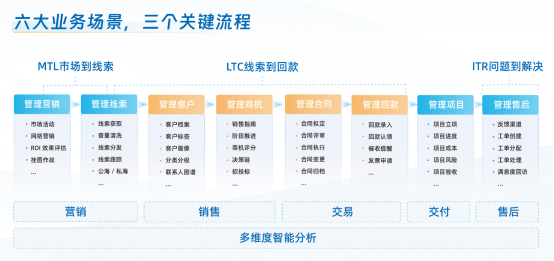 帮助企业实现从营销拓客、线索转化、商机跟进、合同回款、项目交付到售后服务的余售全流程管理,助力企业高效经营。