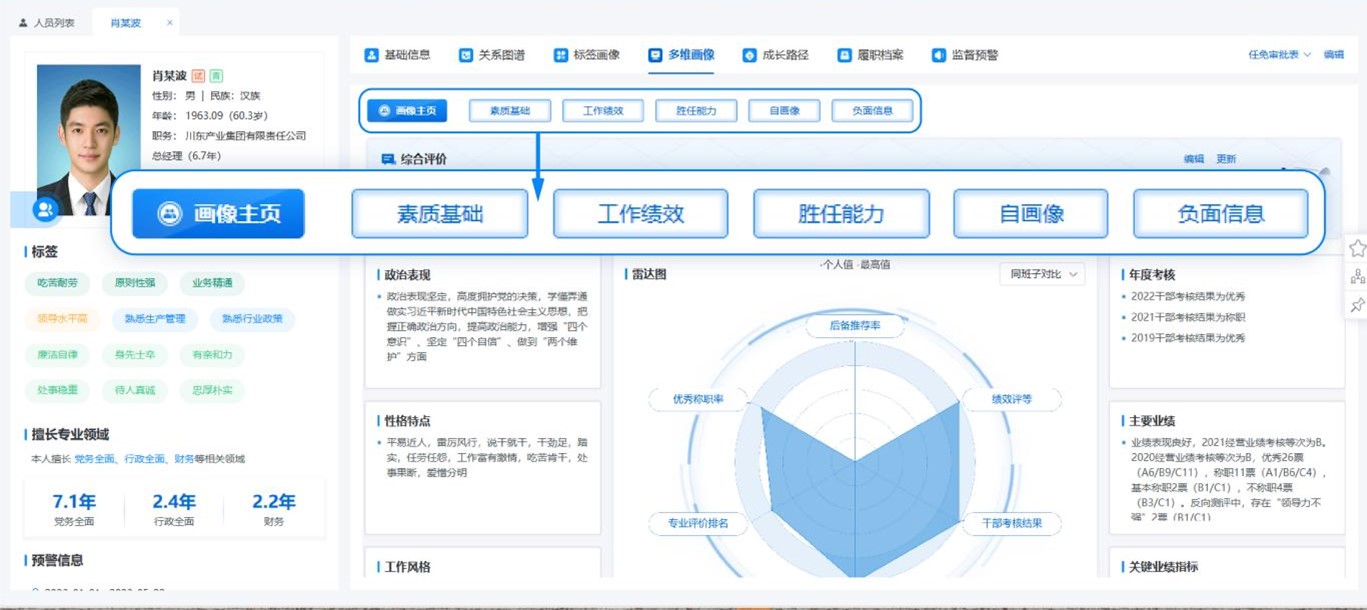 2023年1月召开的全国组织部长会议指出,着眼建设堪当民族复兴重任的高素质干部队伍,落实新时代好干部标准,大力选拔政治过硬、对党忠诚的干部,业务精通、本领高强的干部,敢于担当、勇于负责的干部,敢于斗争、善于斗争的干部,作风优良、清正廉洁的干部,树立选人用人正确导向。在选人用人过程中,如何快速绘制干部画像,多视角、多维度地综合研判干部信息,做到人尽其才,成为组织部面临的重要问题。