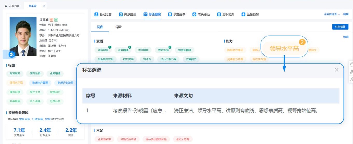 系统以“德、能、勤、绩、廉”评价要素为基础,细化拆分出具体指标,形成基于“素质、能力、业绩、性格、负面”五大维度的画像标签体系。通过OCR、NLP等人工智能技术,从干部档案、考察材料、现实表现、年度报告、测评报告等多类材料中智能分析每个干部人员的特征标签,生成干部人员特征的词云分布图,直观展现出干部人员的优势与不足。
