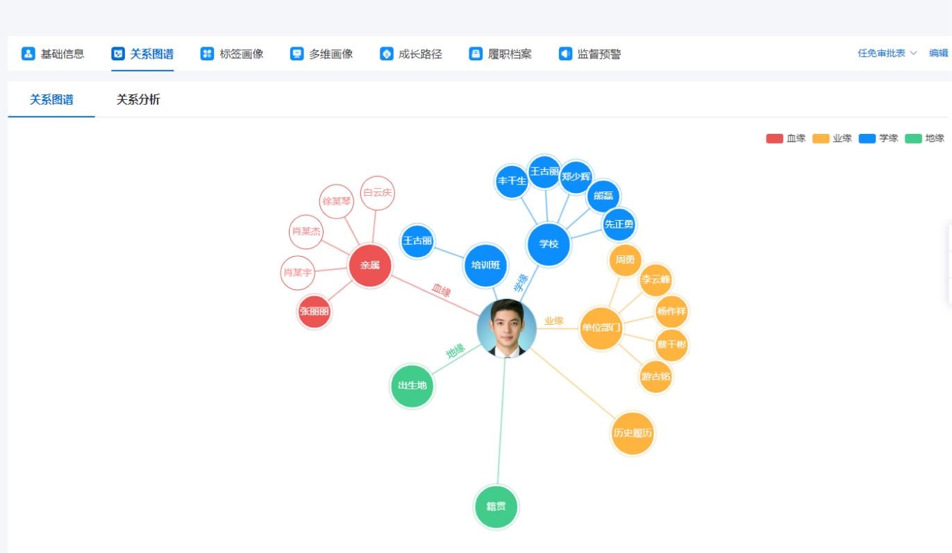 系统基于血缘、学缘、业缘、地缘、趣缘维度建立了五缘关系图谱,将干部的家庭信息、履职信息、培训学习等多维数据深度融合,捕获人与人、人与岗位之间复杂的共事网络信息。例如,一个干部的妻子是另外一个干部的妹妹,我们可通过关系图谱分析,提示出这两个干部存在亲属关系,为任职回避提供参考。