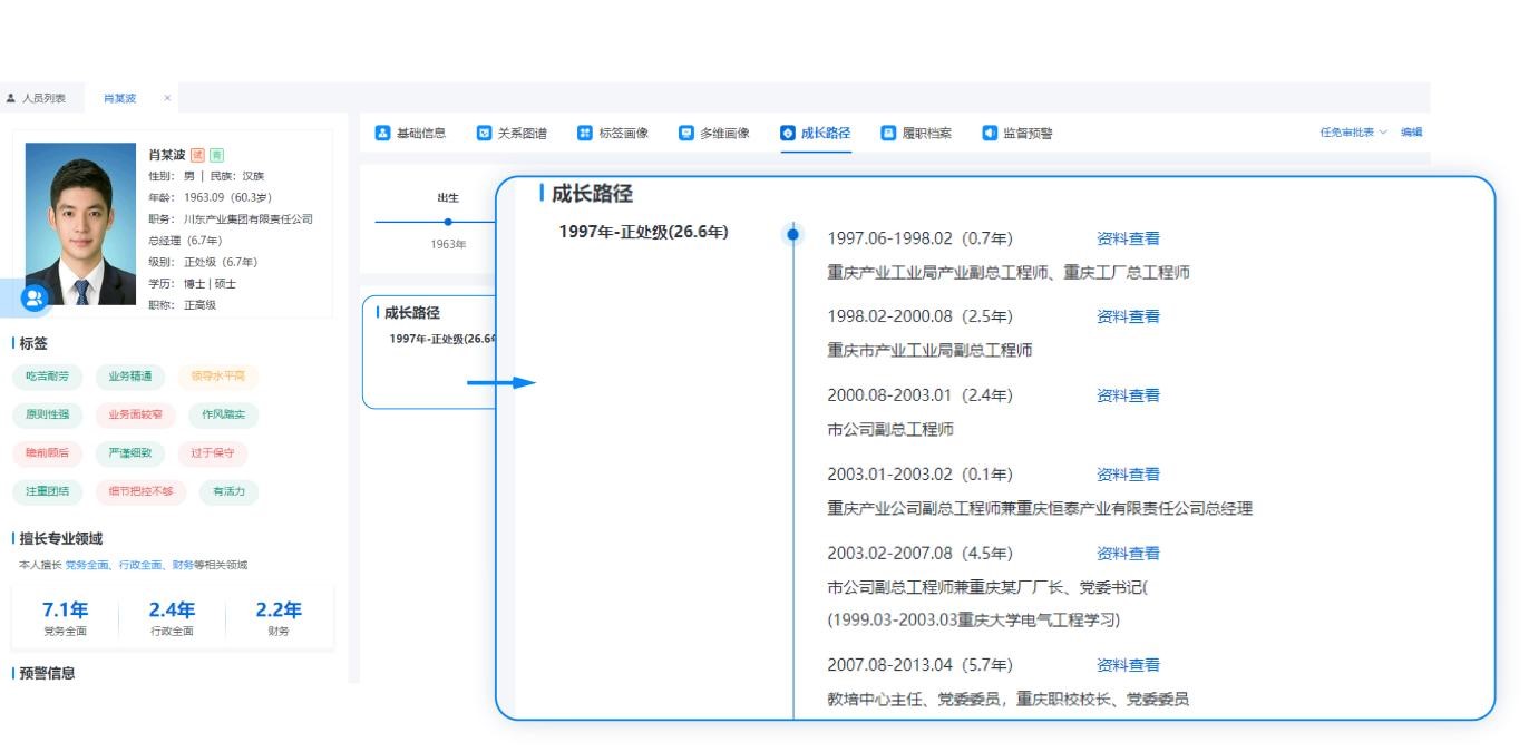 系统根据干部人员职业生涯履历,构建履职时空轨迹画像,从全程履历、多层次地理空间、成长发展等十余个维度,展现干部人员职业生涯全景信息,成长路径一目了然、履职档案记录留痕,为精准以事察人、知事识人、干部交流等工作提供了根本遵循,指明方向。