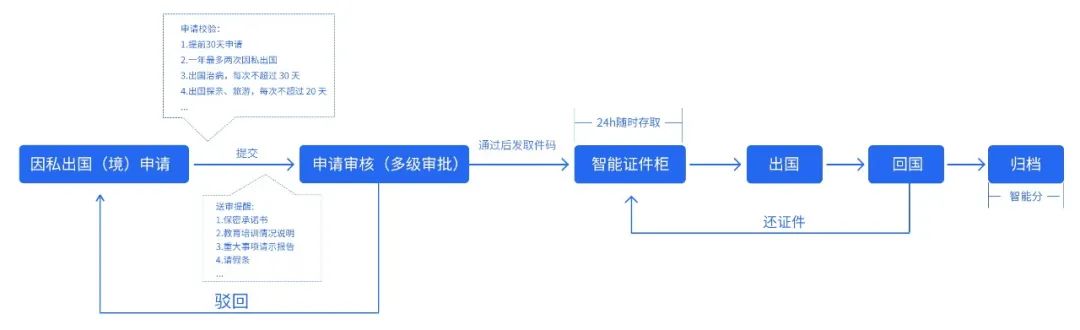 3、监督管理不便。申请材料注意事项多,人工审核易疏忽;干部人员数量多,出国(境)次数超标、未按时返回等情况难及时监督预警;证件资料多,借出返还、证件到期更换等工作,无法及时进行管理。