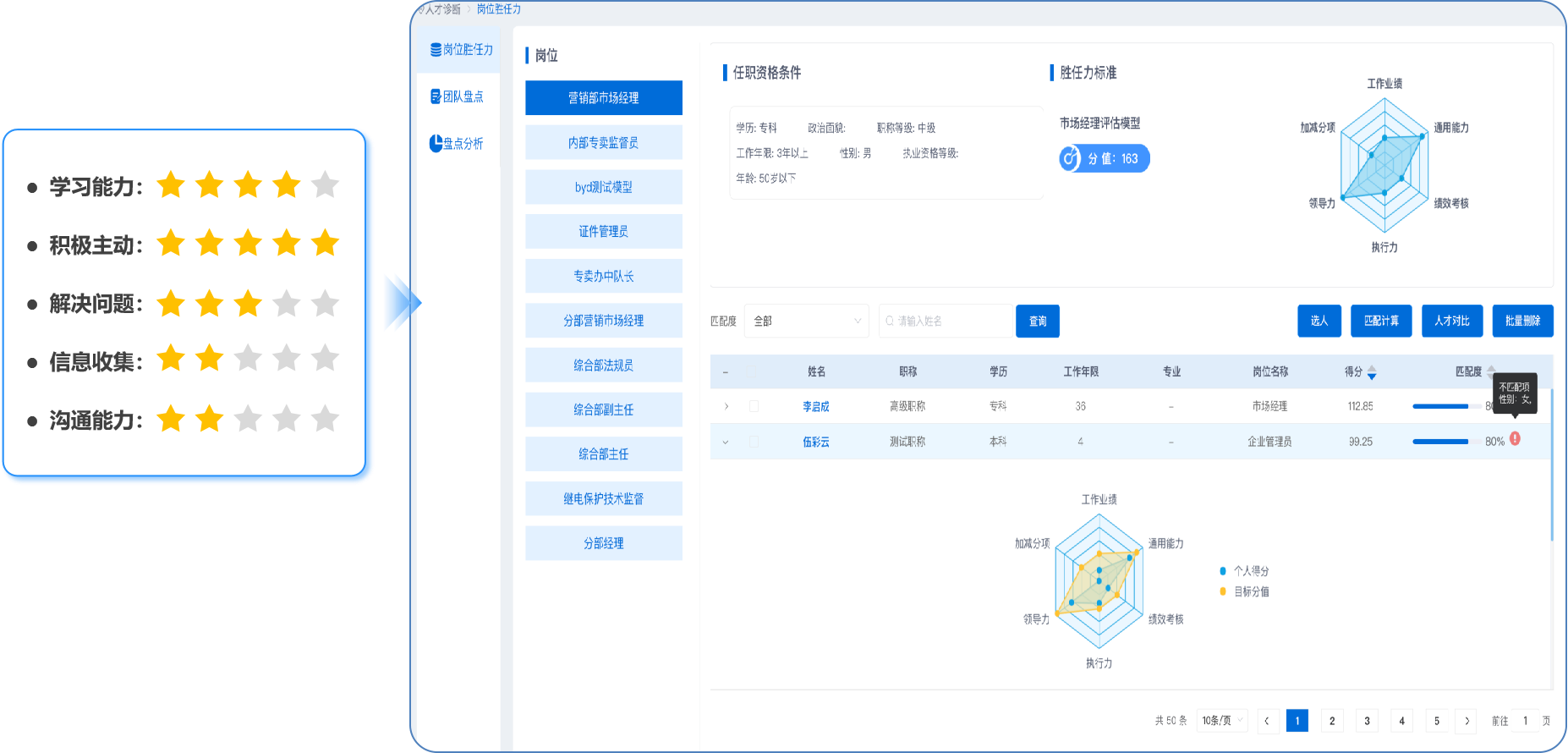 以“岗位胜任力、员工发展”为要素,构建人才画像模型,通过智能算法进行人岗匹配,助力企业”看准人”、”看透人”。
