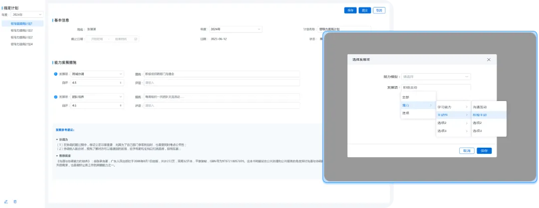 1.发展计划。基于人才诊断结果,形成人才发展后备池,可以对选定的人员推送发展建议,员工本人也可以制定个人发展计划,促进个人能力短板的增强,打造人才发展与企业发展相匹配的高素质人才队伍。