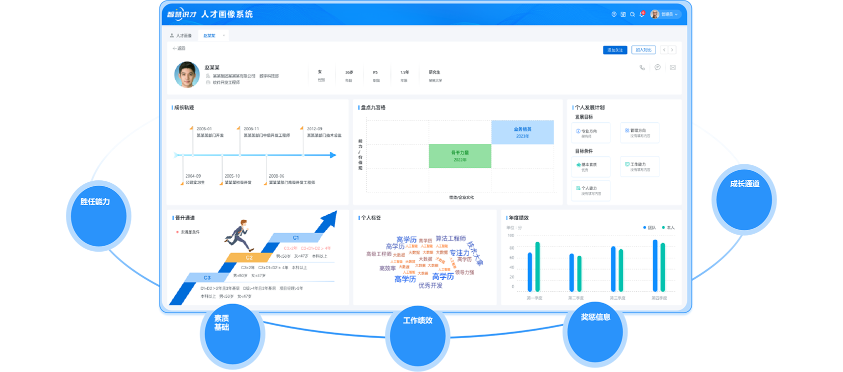 2. 人才画像。基于大数据、人工智能等技术手段,构建人才的素质基础、胜任能力、工作绩效、表彰奖励、负面信息五大维度“全息画像”,一键生成职业生涯报告。