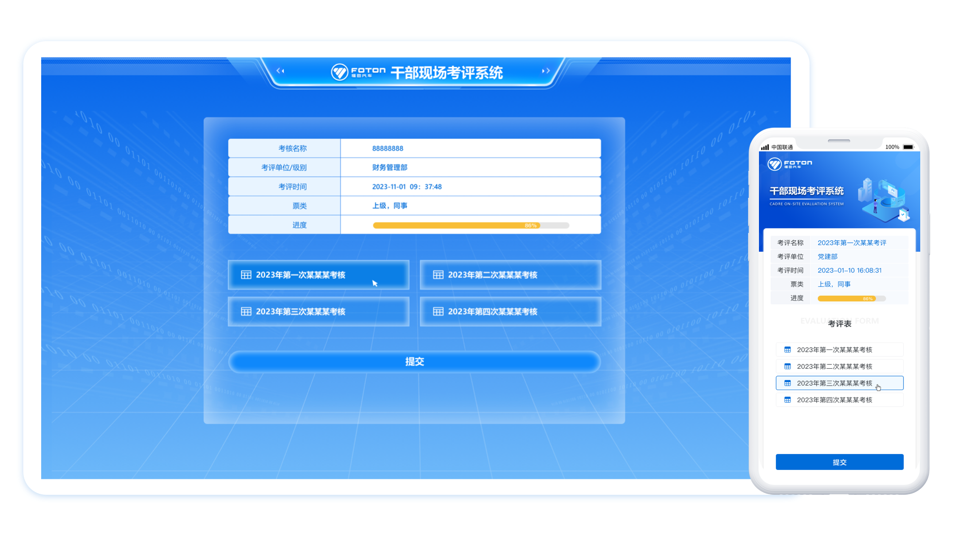 依托金现代的民主测评系统,福田汽车能够根据测评需求灵活创建测评表和关联关系,采用手机扫描二维码进行打分,无需填写任何个人信息,可实时监控测评进度、测评结束后自动汇总生成测评报告,大大降低测评组织成本和工作量。