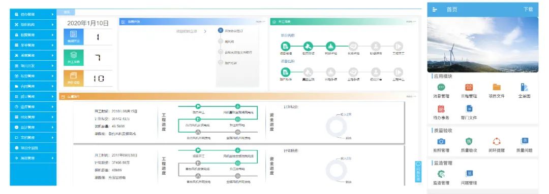 金现代公司风电工程基建管理系统,以质量管控为核心,以进度控制为主线,提供风电场前期开发流程图、项目全景图,帮助项目开发人员、管理人员掌握项目进展、推进项目进程;提供标准监造大纲体系库,全过程动态把控工程建设质量,实现监理监造验评双控;提供质量关联进度模型,自动生成项目整体进度、单位工程进度、工程月报,减轻一线员工数据录入工作量,避免工程进度虚假上报,确保项目按期高质量交付。