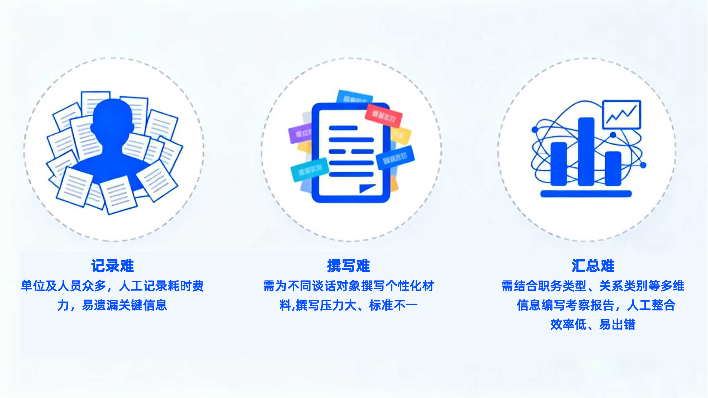汇总难:需结合职务类型、关系类别等多维信息编写考察报告,人工整合效率低、易出错。