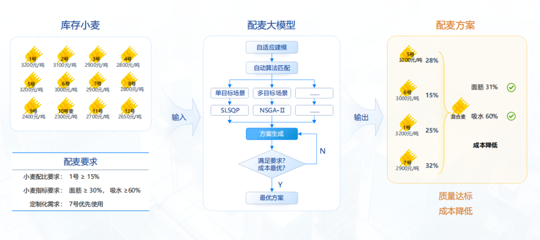 以面粉厂配麦场景为例,工作人员需要从几十个原粮仓中,基于个人经验,综合考量小麦面筋等十多种指标及价格,做出配麦决策。虽然在这一过程中,也可以基于一些数学统计计算来优化选配,但由于指标约束多、计算复杂,依赖人工计算配麦效果不稳定,难以找出符合产品指标的成本最优解,产品指标时有波动。
