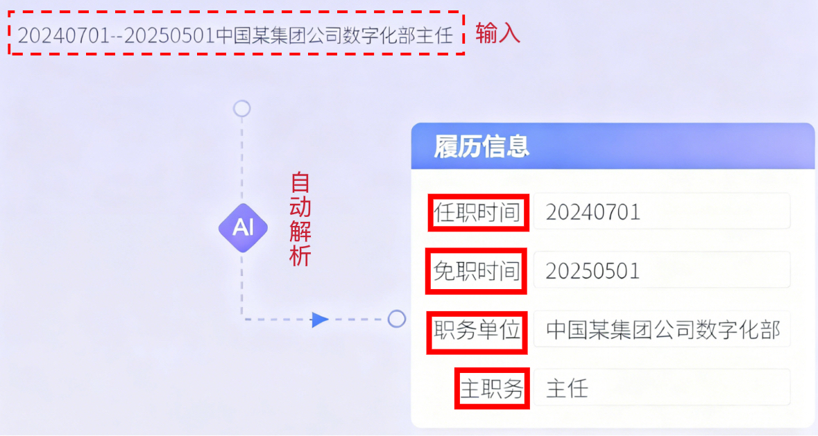 六、AI信息维护-维护履历信息 央国企干部人员数量众多,履历信息、家庭信息、奖惩信息经常变动,需要手动维护,繁琐费时。 如今,AI能够自动校验、识别、补全干部信息,减少人工录入工作量,将一个干部信息的维护时间从十几分钟缩短至几秒钟。 以上应用源自金现代“智慧识才”干部管理团队的研究成果,该团队于2025年已经发布了业内首个专注于组织人事管理领域的垂直大模型——“AI智慧组工”。 “组织工作具有极强的政策严谨性和业务复杂性。”金现代智慧识才产品中心主任李旭表示,“我们通过十余年深度服务央国企组织部数字化,建立了包含制度规范、业务流程、评价维度的完整知识体系,这是大模型精准理解业务需求的核心基础。”这也正是通用大模型难以逾越的壁垒——缺乏对专业知识的深度训练,极易在术语解读和文本理解上出现偏差。