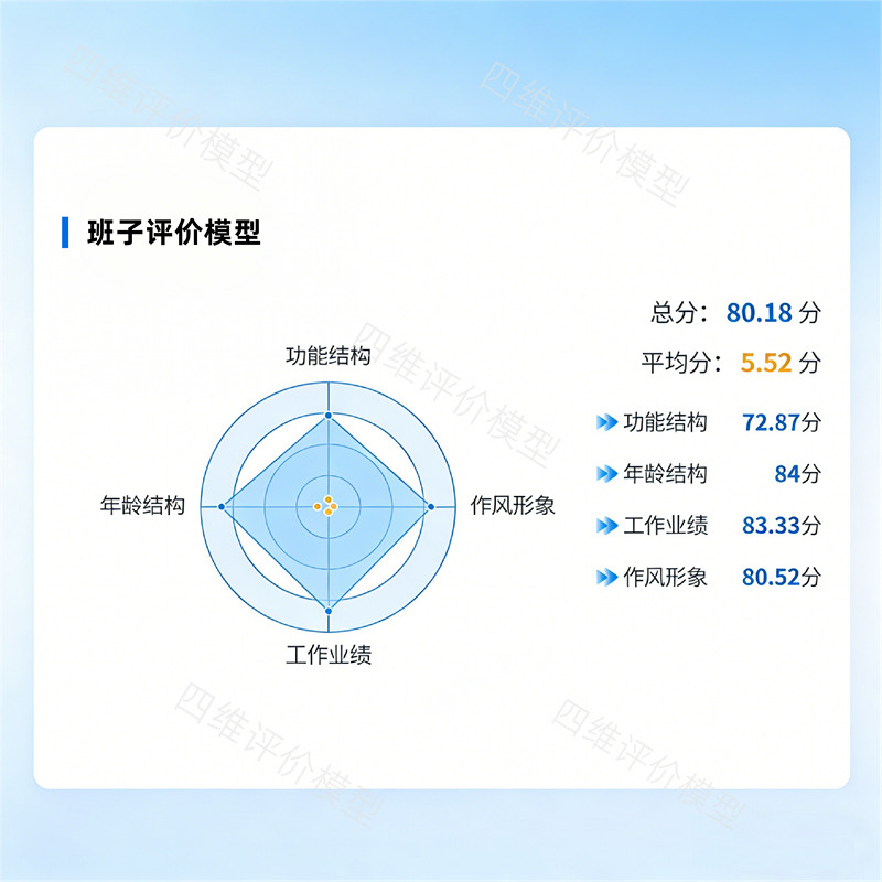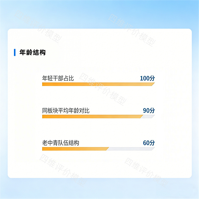 年龄结构维度聚焦班子梯队建设核心,重点围绕老中青搭配合理性、优秀年轻干部占比达标情况、班子平均年龄行业对标水平三大核心指标,逐项赋予权重、量化评分。