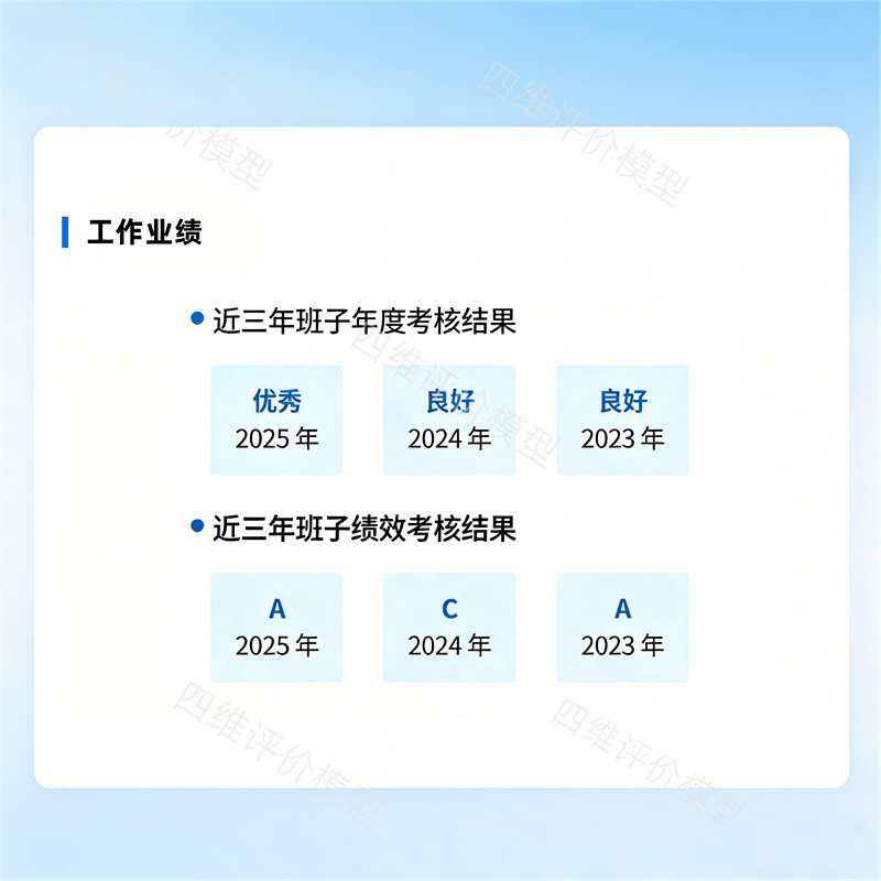 工作业绩维度立足长效评价,聚焦班子近三年年度综合考核、绩效考核结果,将定性评价全面转化为定量分值:年度综合考核优秀、良好分别对应标准分值,绩效考核A级、B级分级赋分。通过数据化呈现三年业绩变化趋势,清晰勾勒班子履职成效曲线,为干部调整、班子优化提供直观、可靠的数据依据。