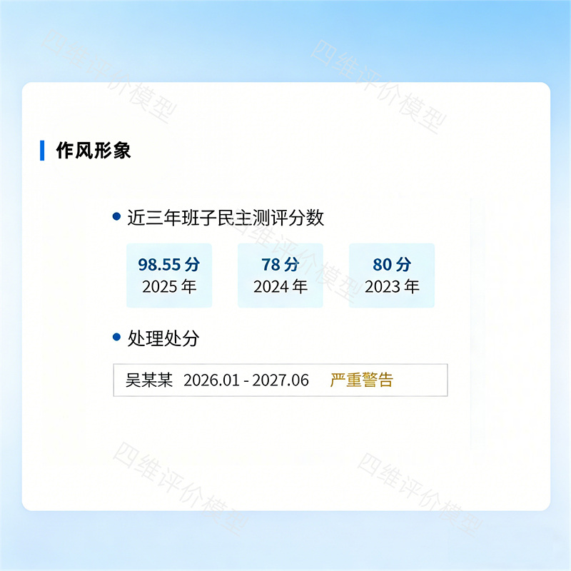 作风形象维度坚守从严治企底线,综合考量近三年民主测评作风形象得分、班子成员惩戒情况,评价规则刚性明确、底线清晰。若班子成员存在处分且在影响期内,按人数逐项扣减总分,将作风建设“软要求”转化为可执行、可问责的“硬约束”,压实全面从严治党政治责任。
