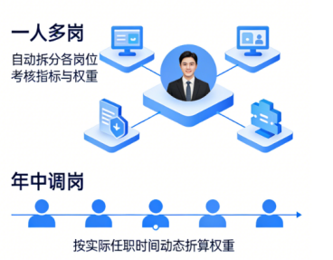 尤为值得一提的是,针对管理实践中常见的“一人多岗”及“年中调岗”复杂场景,系统创新实现多岗位兼任与调岗期动态权重分配方案:当考核人员同时兼任多个管理岗位时,系统自动拆分各岗位的考核指标与权重;若发生中途调岗,只需维护岗位变动时间,系统即自动按实际任职时间权重进行动态折算与调整。这一功能彻底解决了传统模式下人工计算繁琐、责任划分不清的痛点,使考核结果真正反映个人实际贡献。