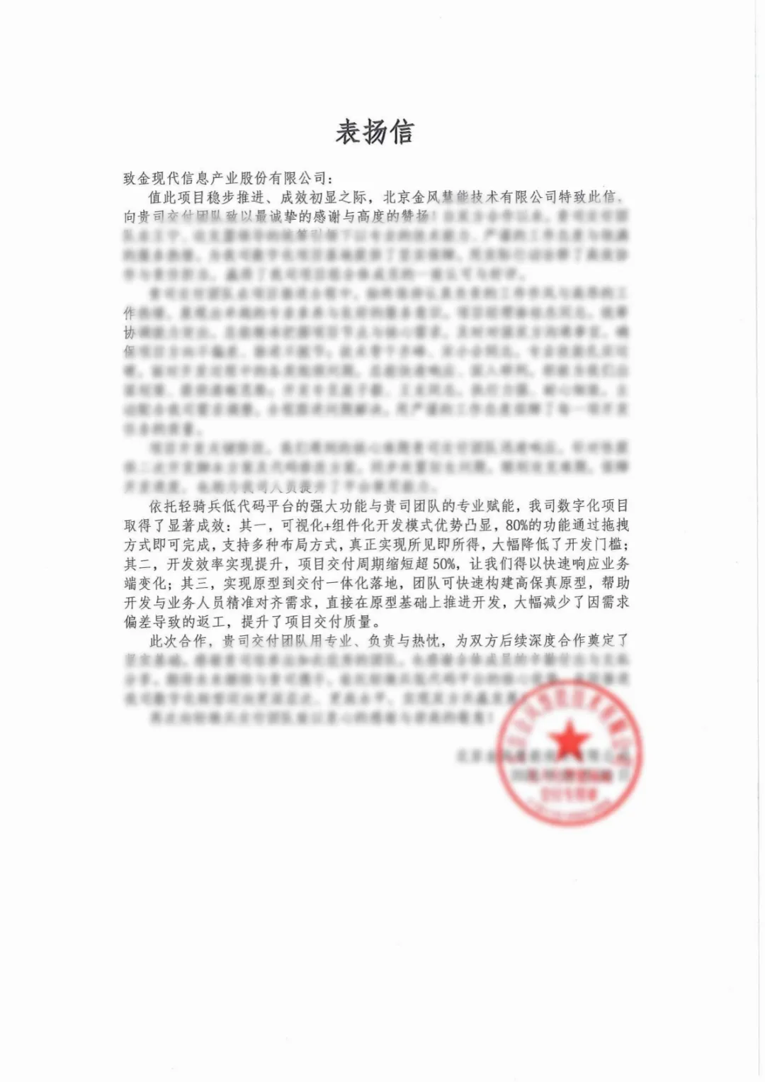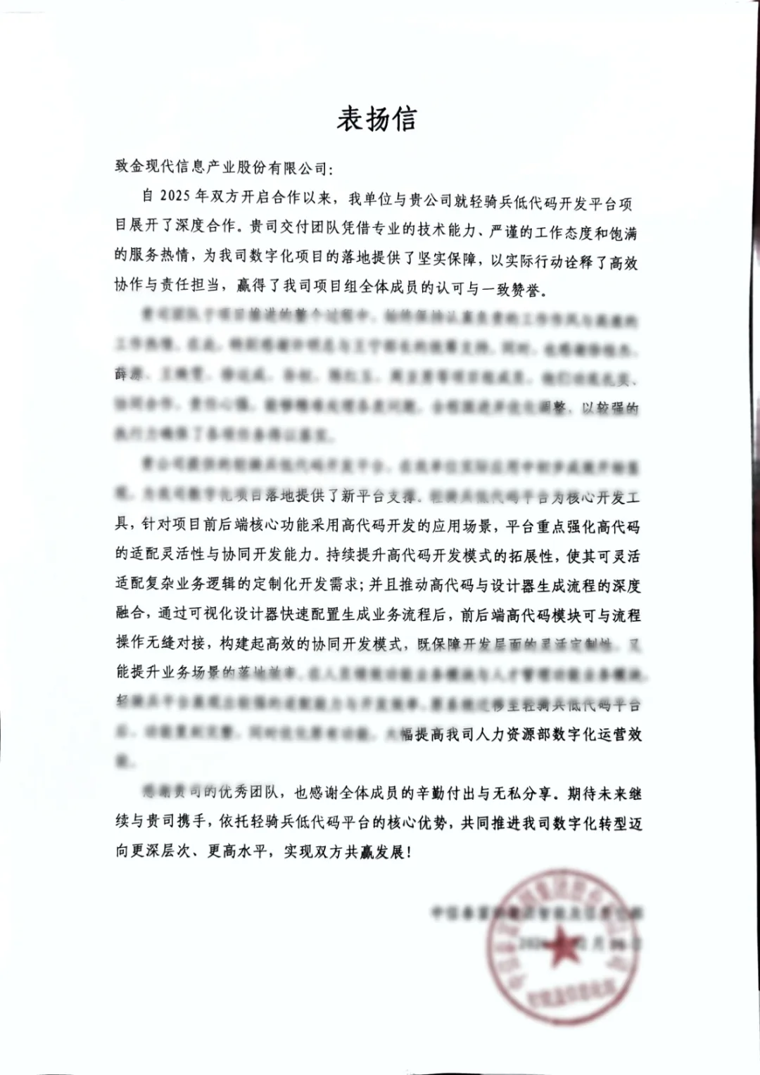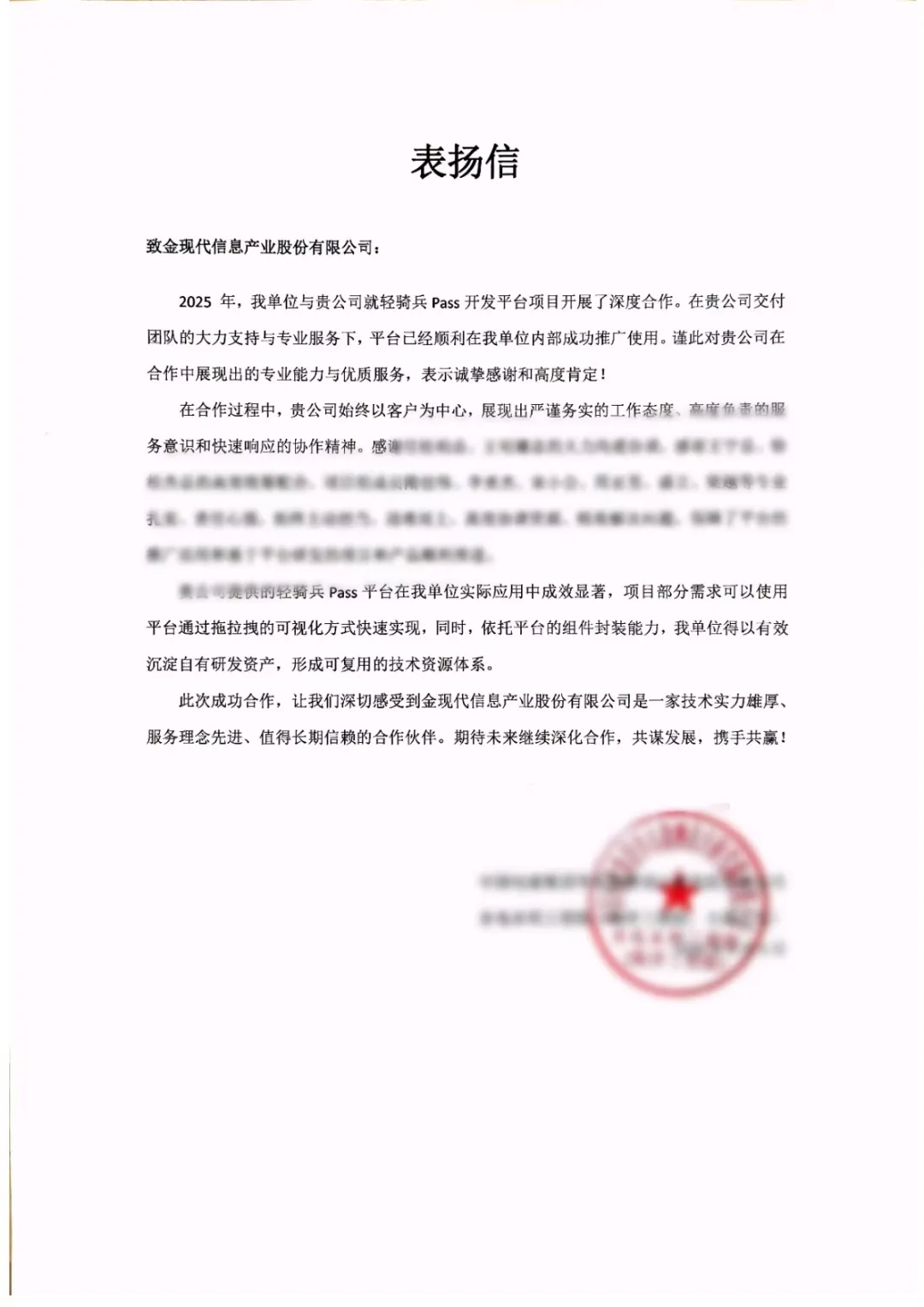 近期,金现代轻骑兵低代码PaaS平台接连收到多家行业龙头企业的表扬信,覆盖制造、金融证券、能源电力、工程设计等领域。每一封表扬信,都是客户高度认可与合作共赢的生动见证;每一次点赞肯定,都是项目成效的有力印证与携手转型的坚实足迹。