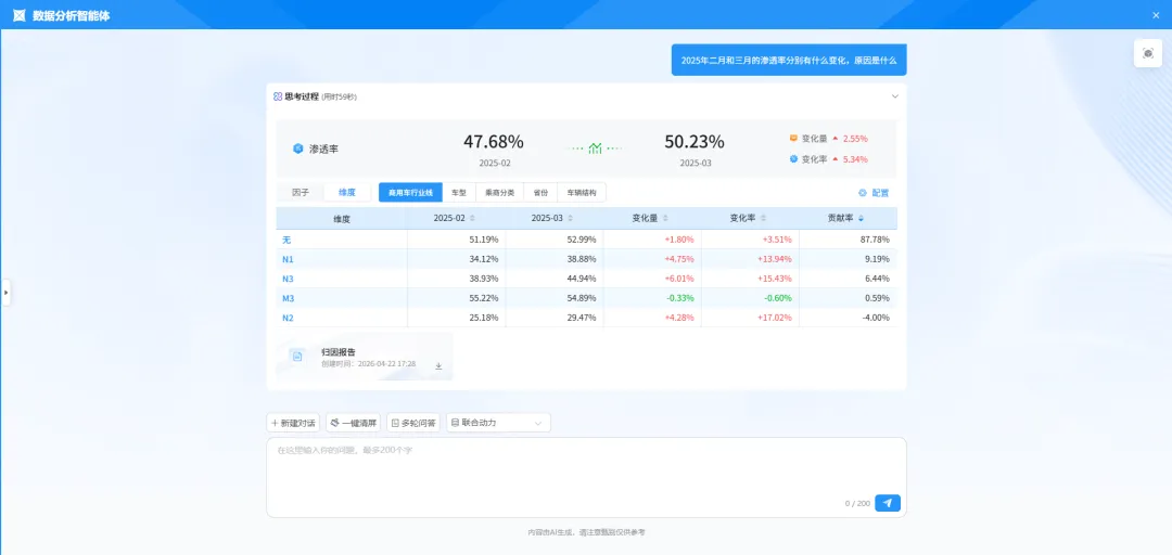 发现波动后,Agent自动多维度下钻、交叉比对,快速定位是渠道、区域、商品还是活动导致。过去需要耗费分析师半天甚至一天的工作,现在几分钟就能跑完,并且整个过程没有遗漏、偏差更小、不依赖分析师的主观判断。