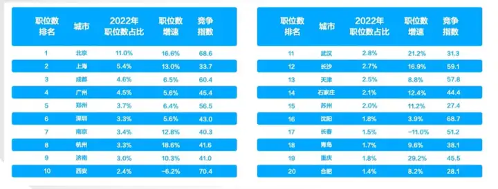 从城市角度看,生物医药/医疗职位数占比TOP20城市共计拥有64.9%的生物医药职位,其中一线城市职位更多,但成都职位占比超过广州,位居第三。大家在选择就业城市时,可以综合个人意愿、竞争指数、职位总数综合考虑,不必一味追求一线城市的光环。