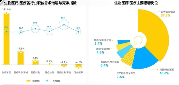 目前,生物工程招聘需求增速领先全行业。其中,生物工程招聘需求同比增长141%,医药批发/零售的竞争指数最高;而专业性医疗类岗位的招聘需求最高,达到37.3%。