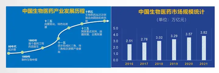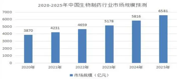 生物医药行业是关系国计民生的重要产业,国家高度重视并出台了《健康中国2030规划纲要》《“十四五”生物医药产业发展规划》等多项政策,为行业发展提供了明确、广阔的市场前景。目前我国生物医药行业稳定发展,预计2022年市场规模将突破4万亿元,2025年生物制药行业市场规模将超过6500亿元。