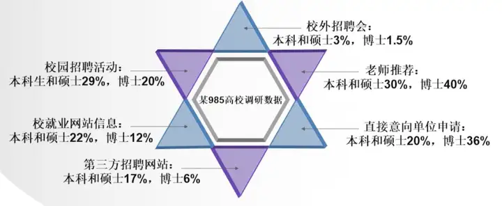 根据某985高校的调研数据,毕业生求职渠道主要有六种,其中不同的求职渠道学历占比也不相同。